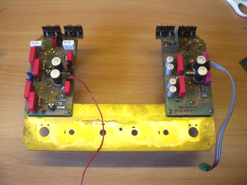 Die eine ist nur die Poti Muttern, Schalterschrauben und vier M4 Schrauben in den Ecken zu entfernen, dann kann die ganze Platte mit den Verstärkern abgenommen werden,