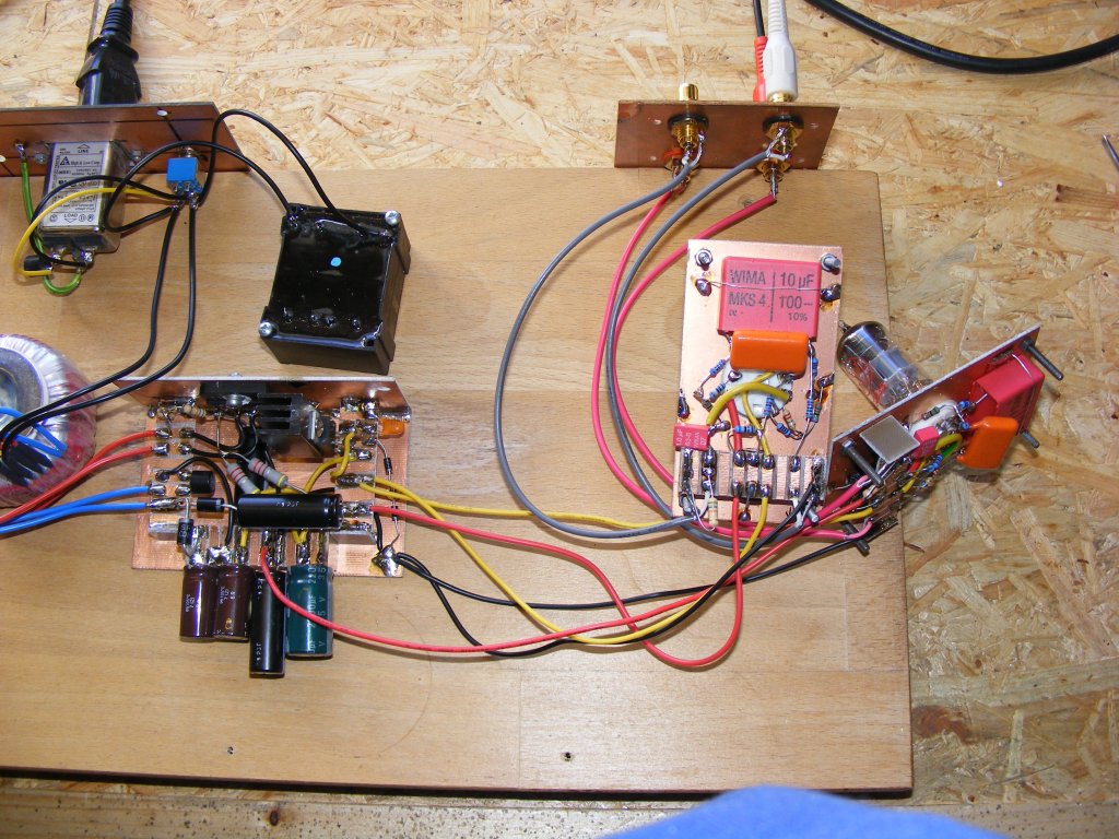 Fertig gestellt das Netzteil und die Verstärkerplatten. Im Gegensatz zur Grundig mit Ub 310V verwende ich hier 270V für ein noch besseres Rauschverhalten, anstelle der von Grundig gewählten 2 x 47microFarad Elkos in Reihe verwende ich einen MKS 4 Kondensator mit 10microFarad, der Original Frequenzgang von 2,2Hz - 50000Hz wird dadurch bei der unteren Grenzfrequenz auf ca. 5Hz erhöht was bei den meisten Anwendungen mehr als ausreichend sein dürfte, die restliche Schaltung wurde an die Ub von 270V angepasst, vor dem Ausgangs Kondensator stehen dadurch anstatt 60V nur 40V an was bei dem verwendeten 100V MKS ein wesentlich besseres Klirrverhalten ergibt, der Ausgang ist als Kathodenfolger ausgelegt zur Erzielung einer niedrigen Ausgangsimpedanz. Die Verstärkung der zweistufige Triodenschaltung beträgt hier 7dB, beide Trioden sind stromgegengekoppelt.